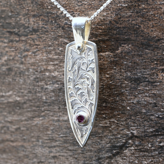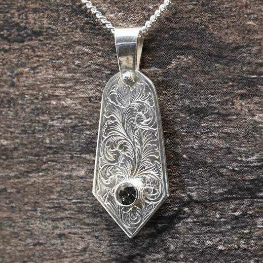 • Silver pendant with lizard and plant design, hand-engraved on a titanium pendant