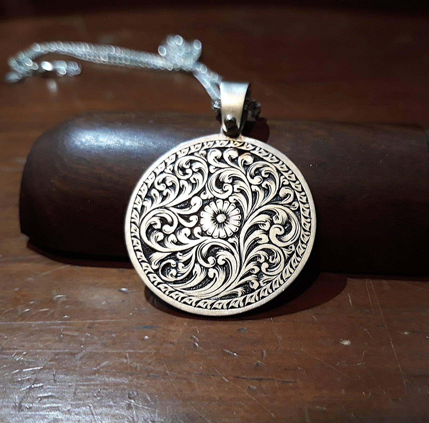 A JBO designed pendant featuring cut-out acanthus on domed sterling silver. This was a vintage-style piece that wasn't over-the-top but complimented the wearer beautifully.
