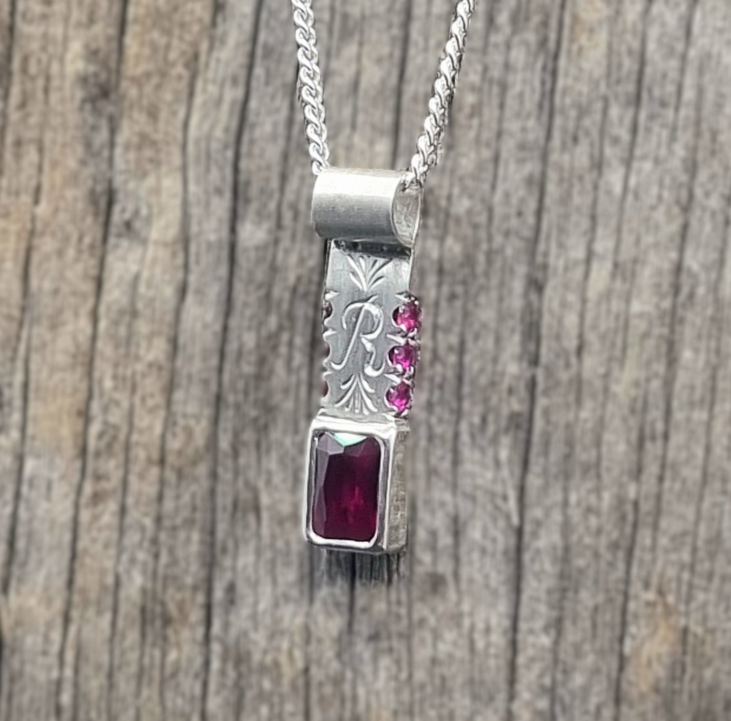 This piece was commissioned as a gift for the customer's daughter. With a gorgeous ruby as the centrepiece, we embellished it with hand-engraving and a personalised "B" initial.