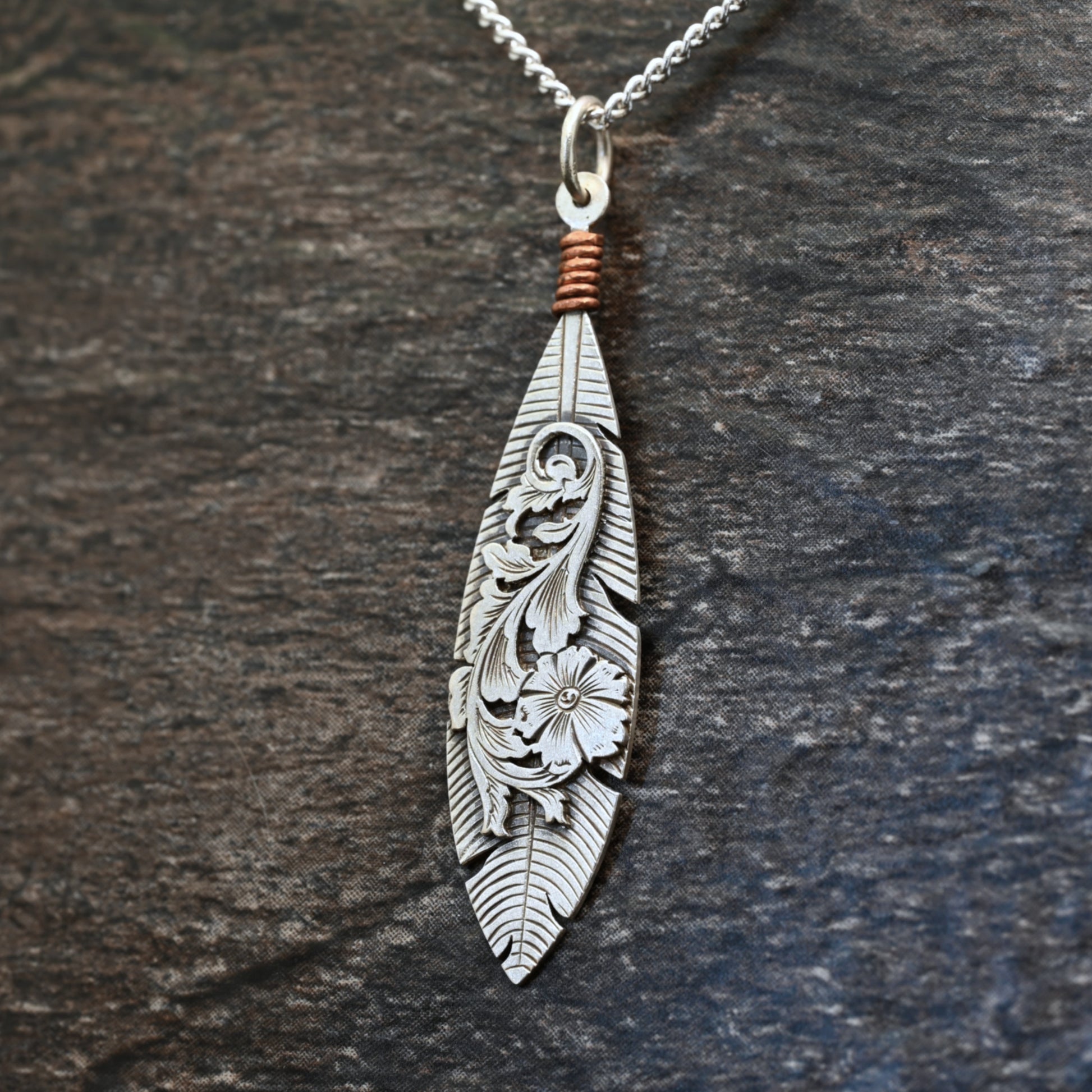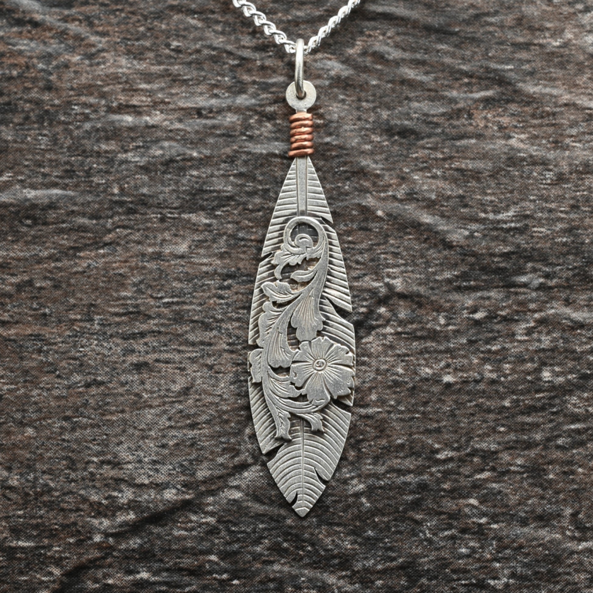 Feather background with layered acanthus vine. Hand-engraved sterling silver with copper feature.