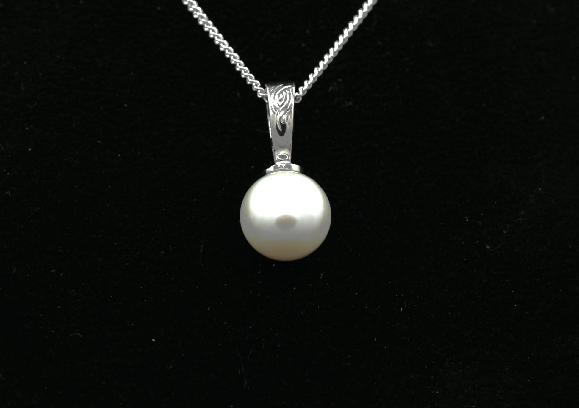 Freshwater cultured pearl enhancer with hand-engraved bail.