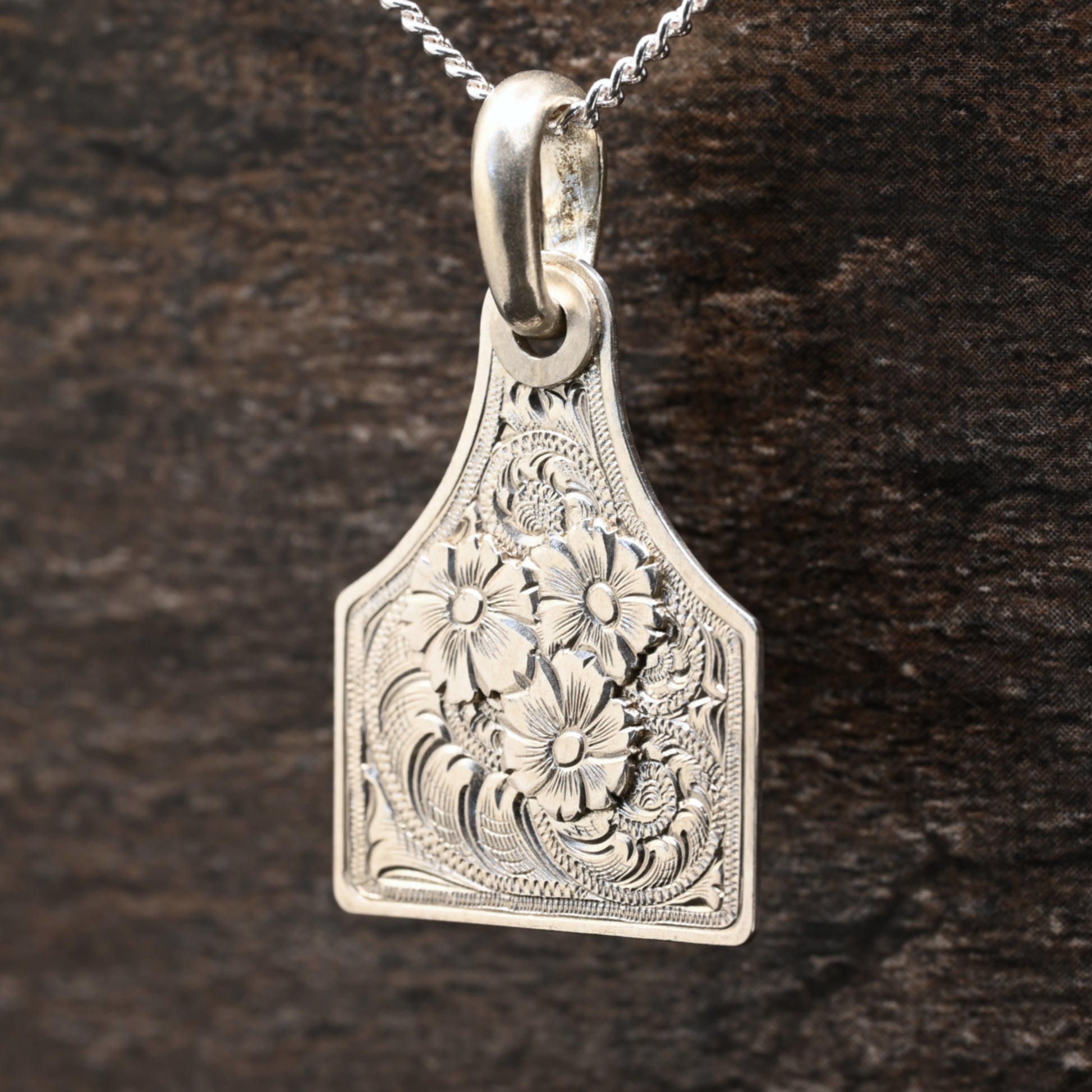 Made for the dedicated cowgirl, this cattle tag pendant is beauty and heart all in one. Hand-engraved with flowers and scroll-work, it will not go unnoticed.
