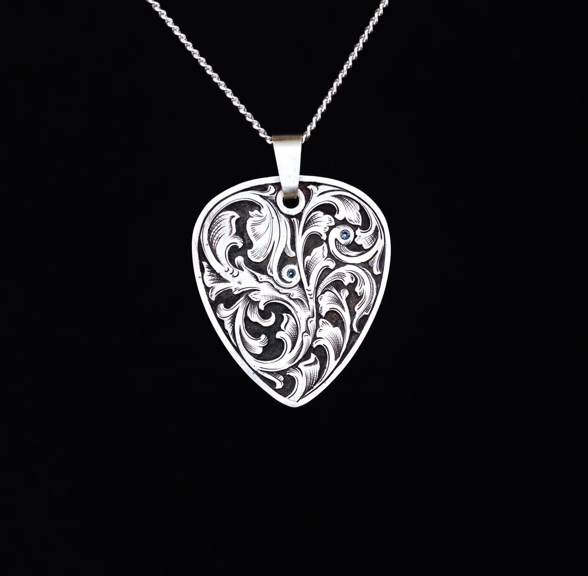 A hand-crafted sterling silver pendant with hand-engraved acanthus, embracing two 1 mm teal sapphires.