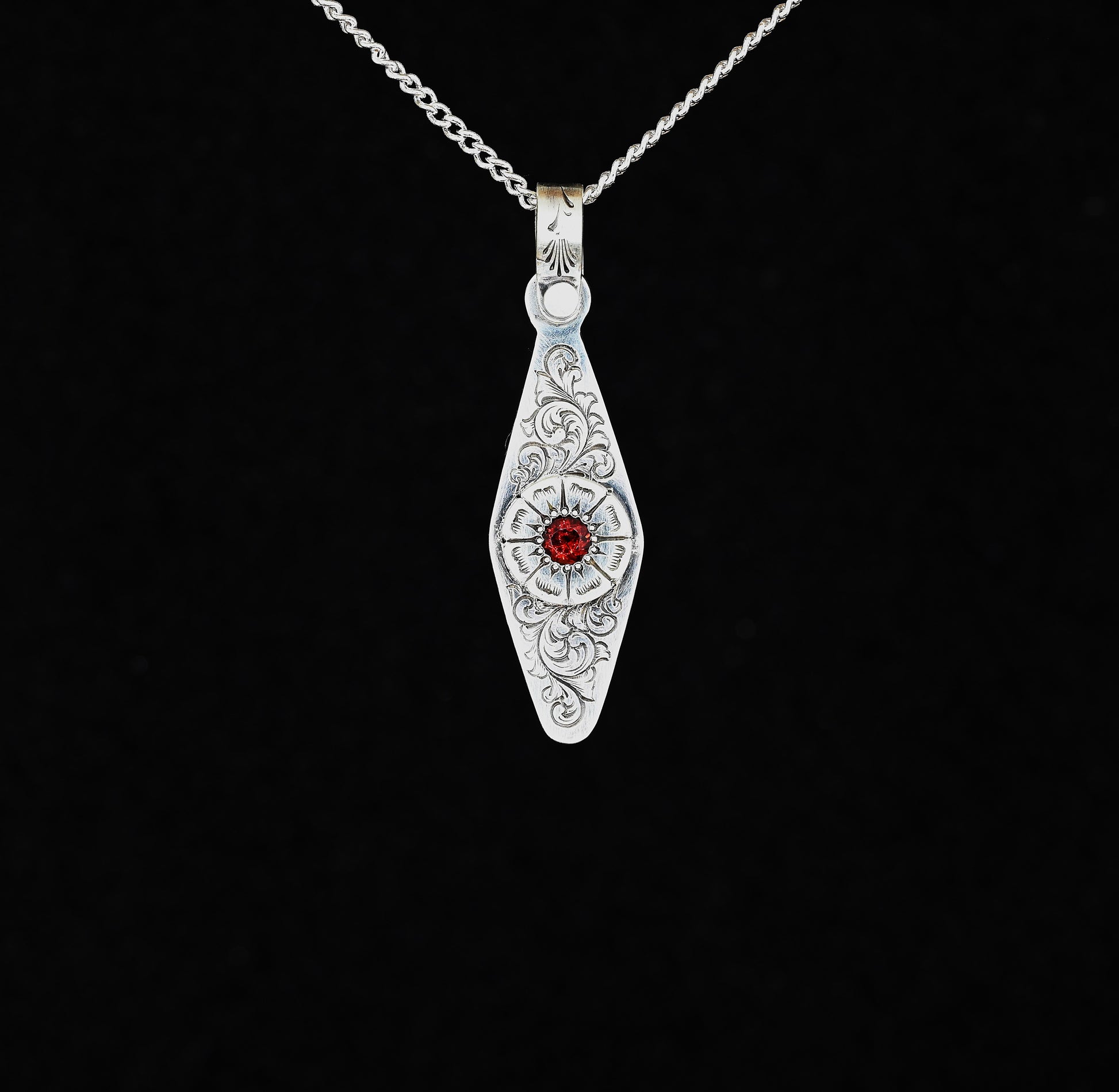 This unique, sterling silver pendant has been hand-crafted and engraved by JBO, with sculpted flower petals and a perfectly placed 3 mm garnet centrepiece.