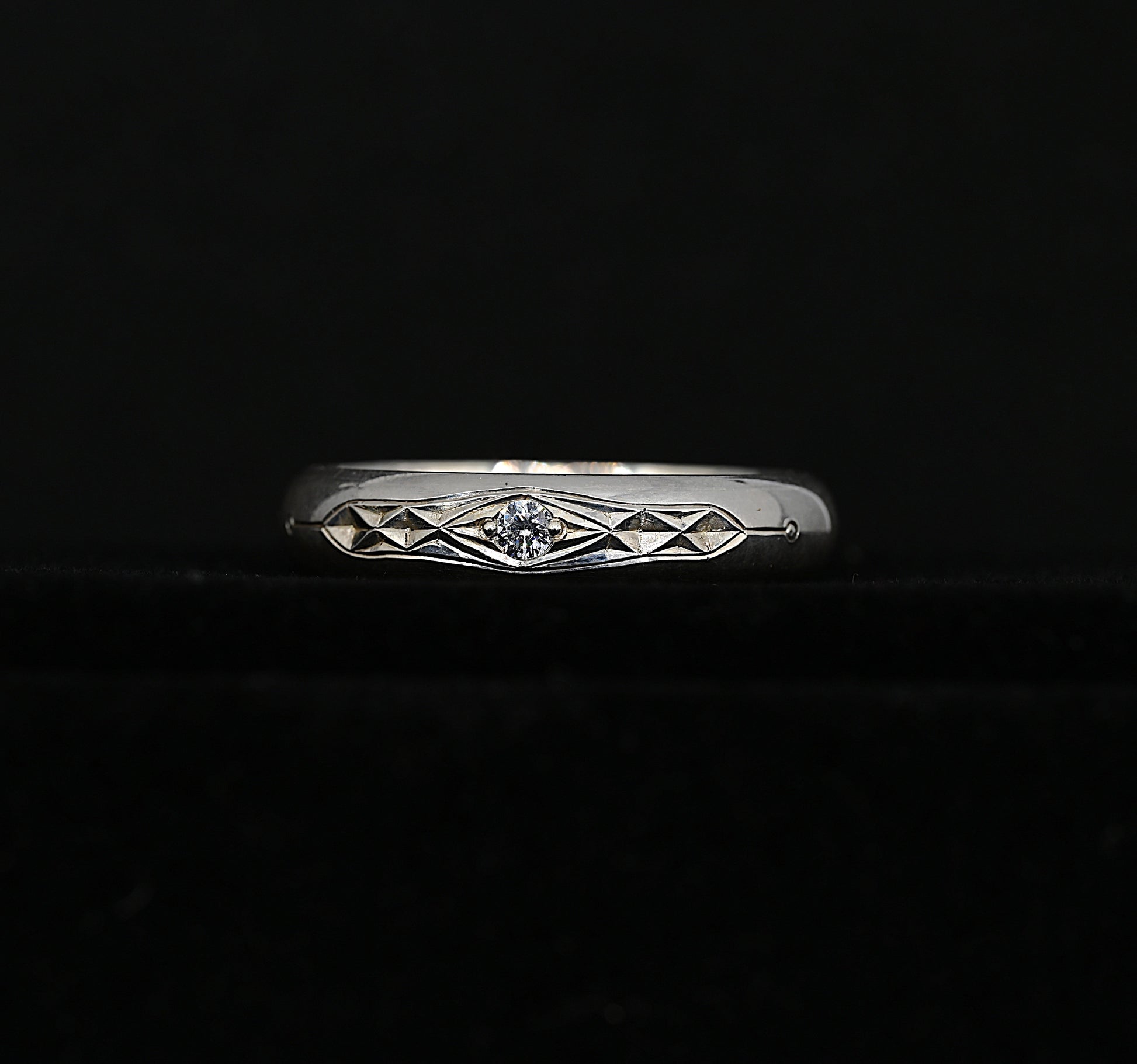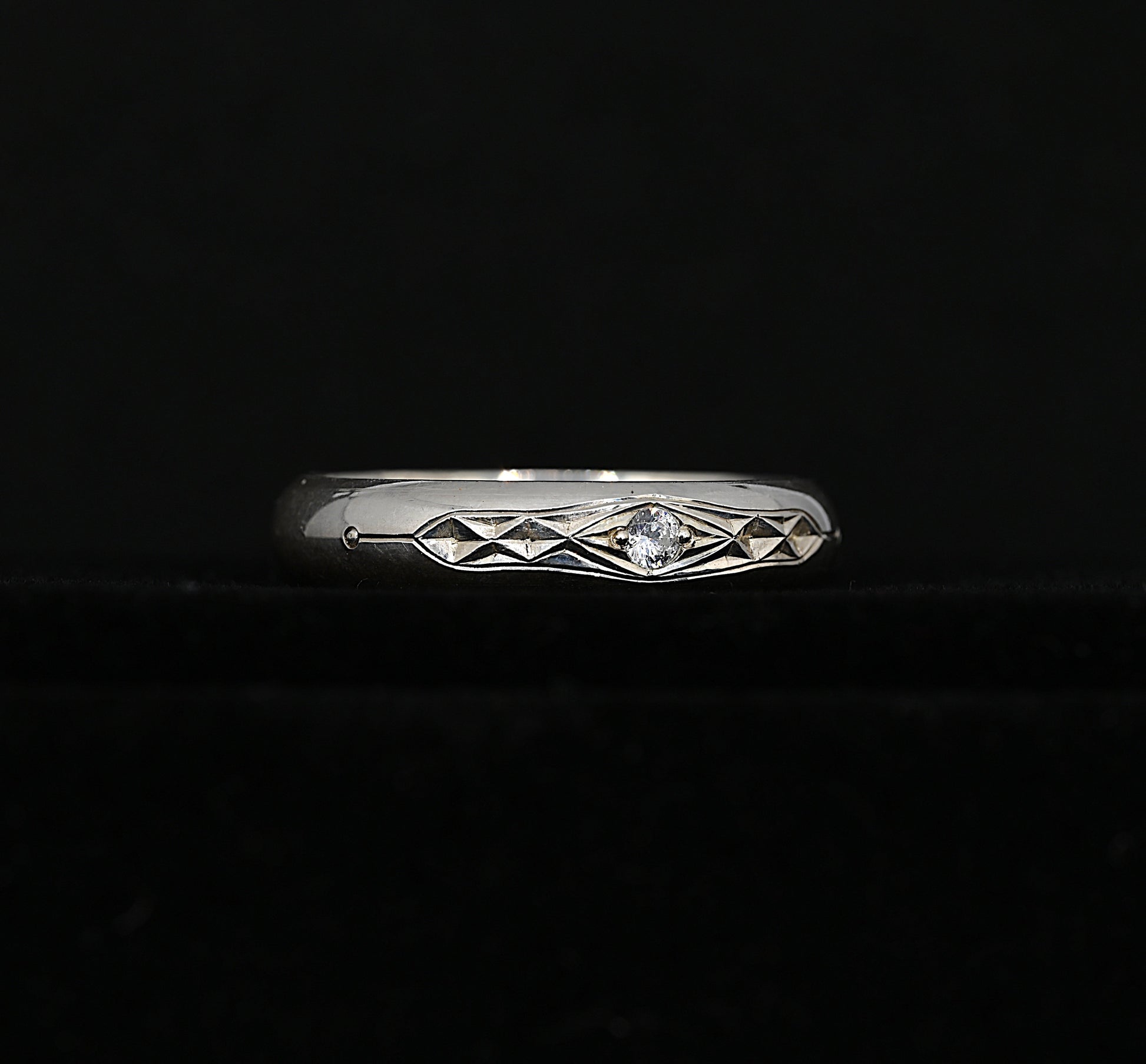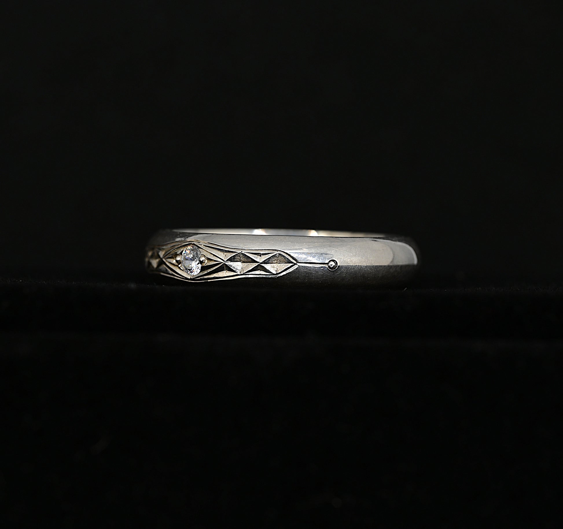 A 3 mm cubic zirconia is centrepiece to the contemporary, diamond shaped hand-engraving on this hand-crafted, solid sterling silver ring.