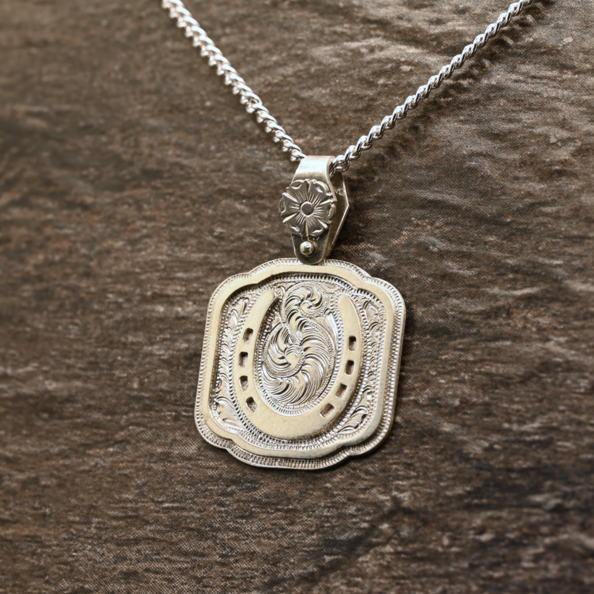 A lucky horseshoe, adorned with scroll-work and a unique floral bail. Hand-crafted and engraved sterling silver.
