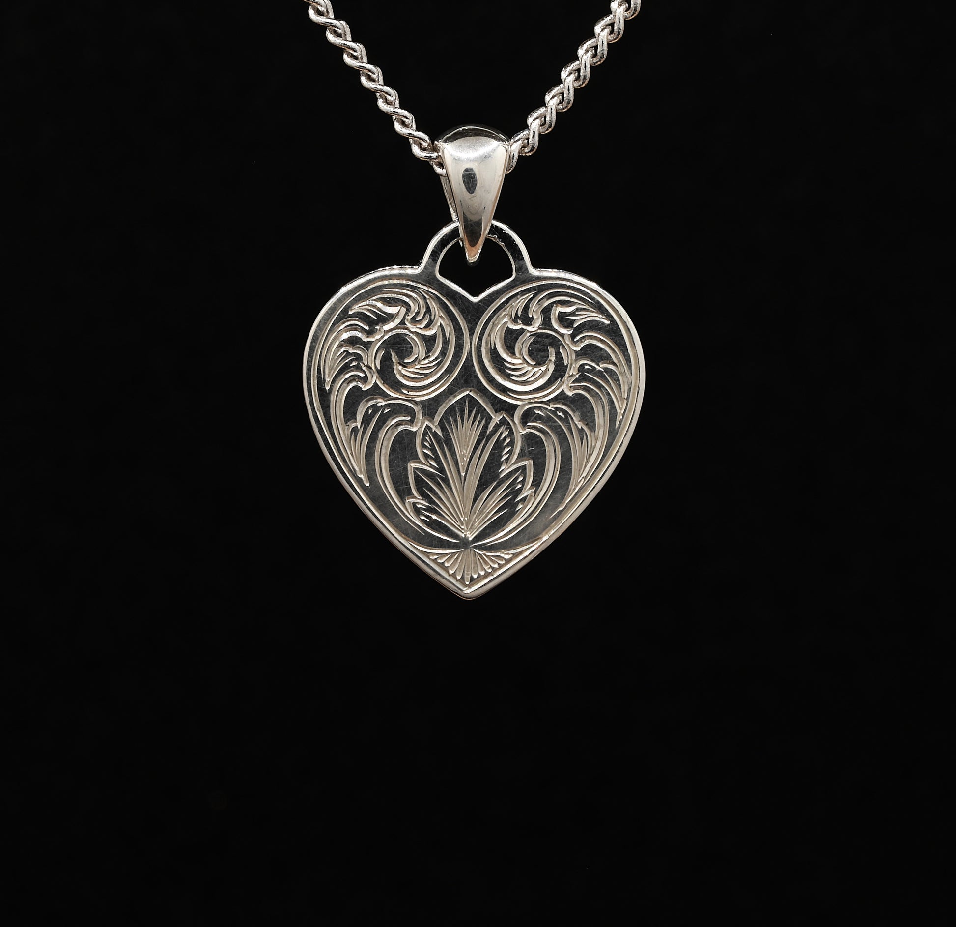 A beautiful fusion of Art Deco and traditional hand-engraving acanthus design adorns this dainty sterling silver pendant