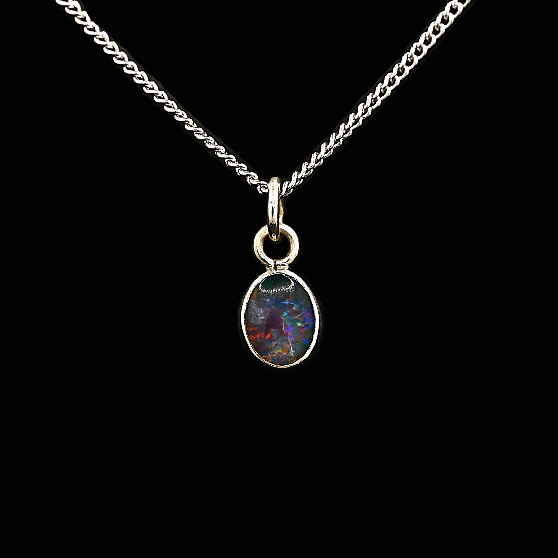 Simple and stunning, this blue/purple/red opal triplet is encased in sterling silver.
