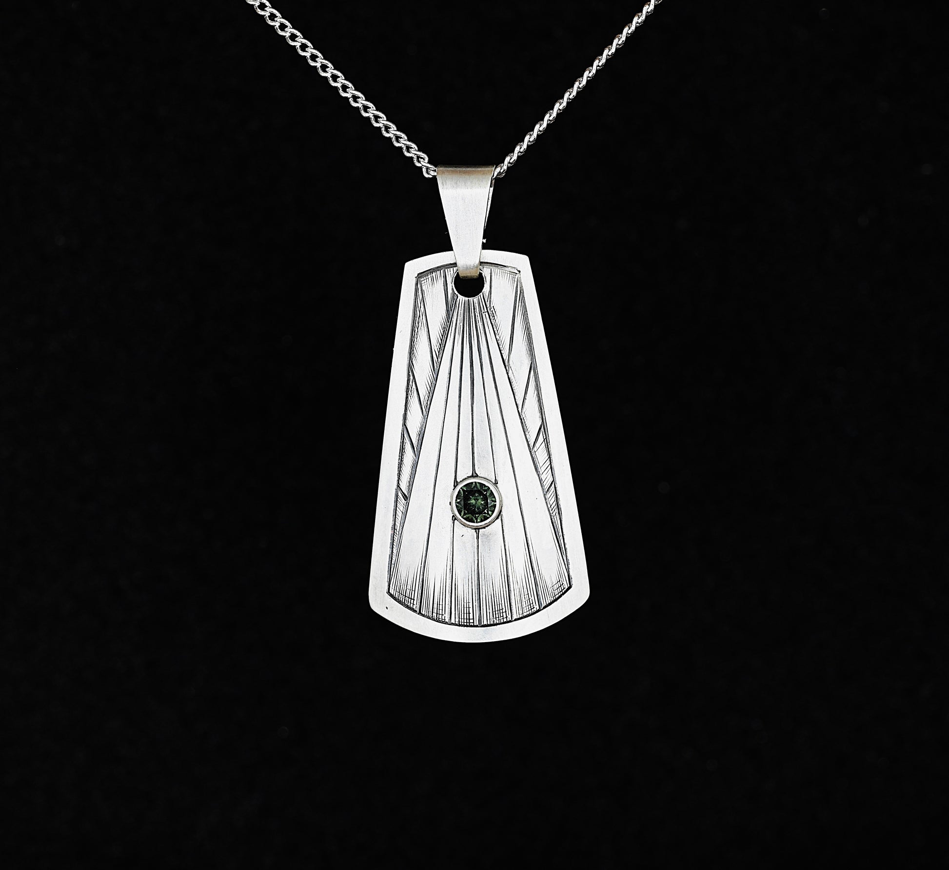 Hand-crafted and engraved, slightly domed, Art Deco style sterling silver pendant holding a 4 mm green tourmaline.